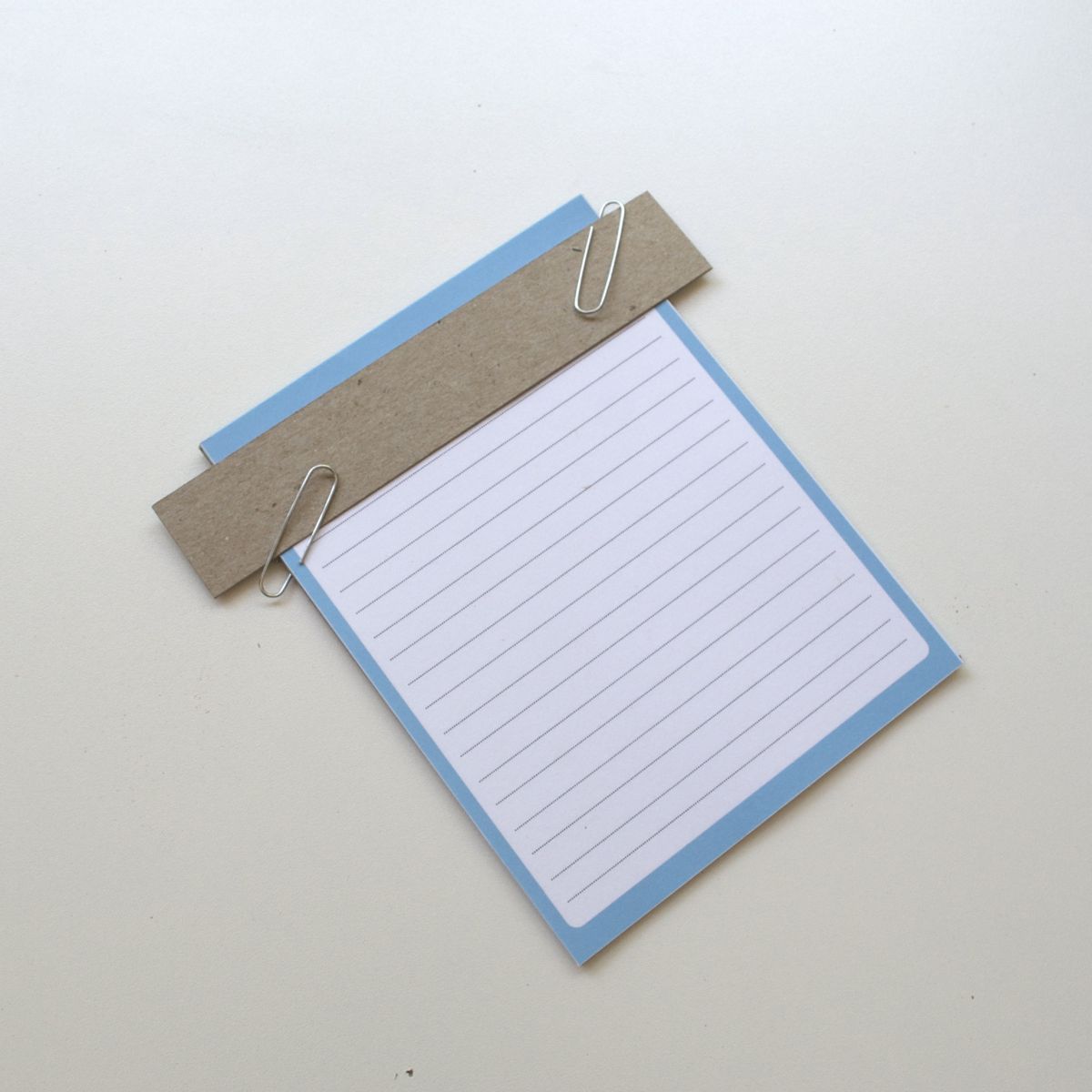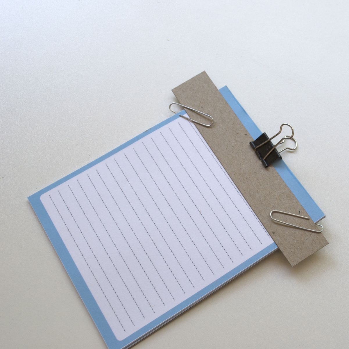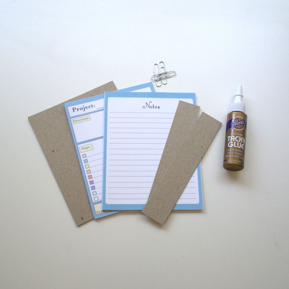 Step 3. Line up top edges of the Project Tracker with the top edge of the chipboard. Place scrap chipboard in front and paperclip all sheets together. Make sure the top edges of the Project Tracker and the chipboard are still aligned.