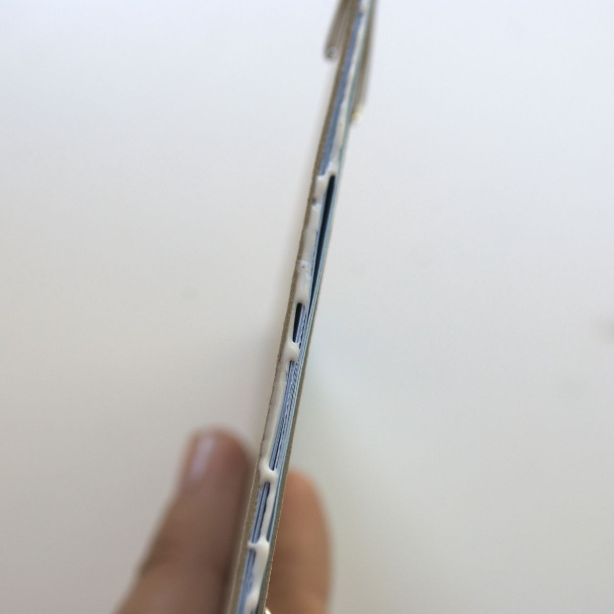 Step 4. Use your fingers to press the center of the packet together and apply a generous amount of glue to the top edge of the papers and chipboard. Use your index finger to even out the glue. Scrape off any glue that has oozed onto the front or back of the packet.